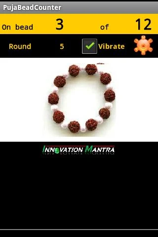 Puja Bead Counter Updated was developed by InnovationMantra on July 4, 2011. It has a 4.5 star average from 55 reviews and over five thousand installations. It is super easy to use! The home screen features an image of what appears to be a wrist mala of rudraksha seeds, although a quick count reveals ten rudrakshas, and a wrist mala should be a ¼ mala, or 27 beads. It certainly has no effect on the usefulness of the app, but something bothered me about the photo, and I finally realized it was because the number of beads didn’t fit my expectation.